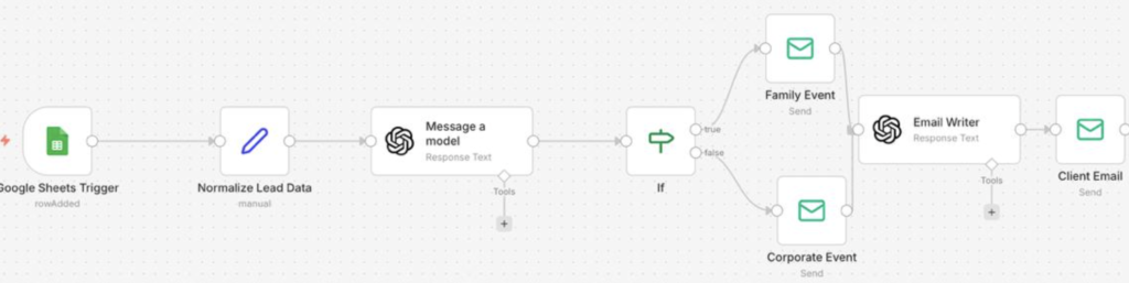 • Conditional automation logic: IF-based routing sends leads into specialized pipelines for each event type (family vs corporate).​