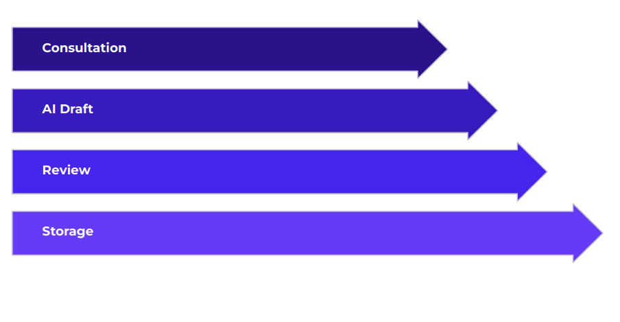 The workflow begins with a normal patient consultation, followed by AI-generated prescription suggestions. Doctors review and finalize with full control, creating secure digital records that are instantly shared with patients. Automated follow-up and outcome tracking complete the cycle.